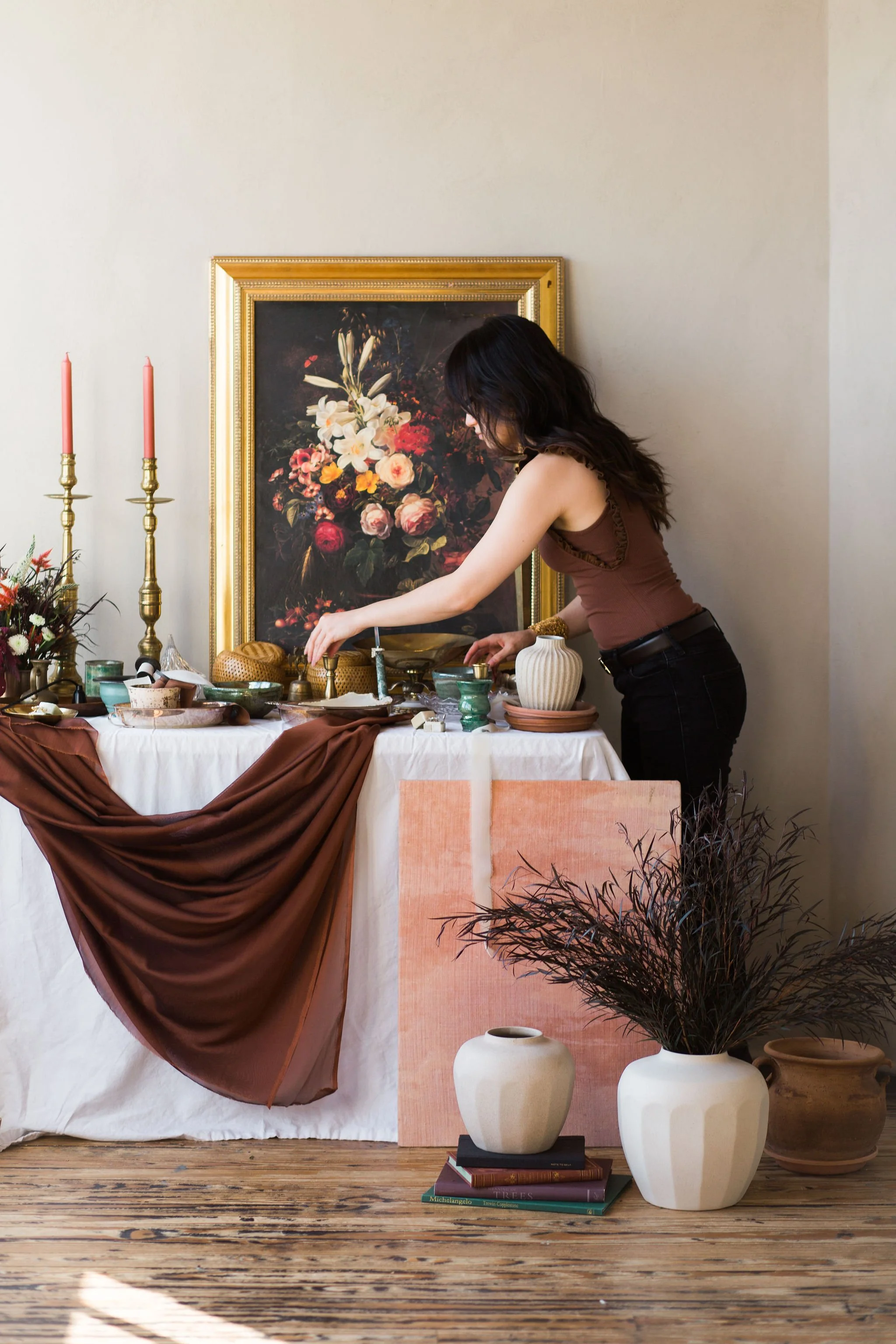 I arranged a table to showcase the collection of props I’ve gathered over the years from antique shops, resale stores, and estate sales. Additionally, I curated a workspace that reflects my design process, allowing for a creative atmosphere.