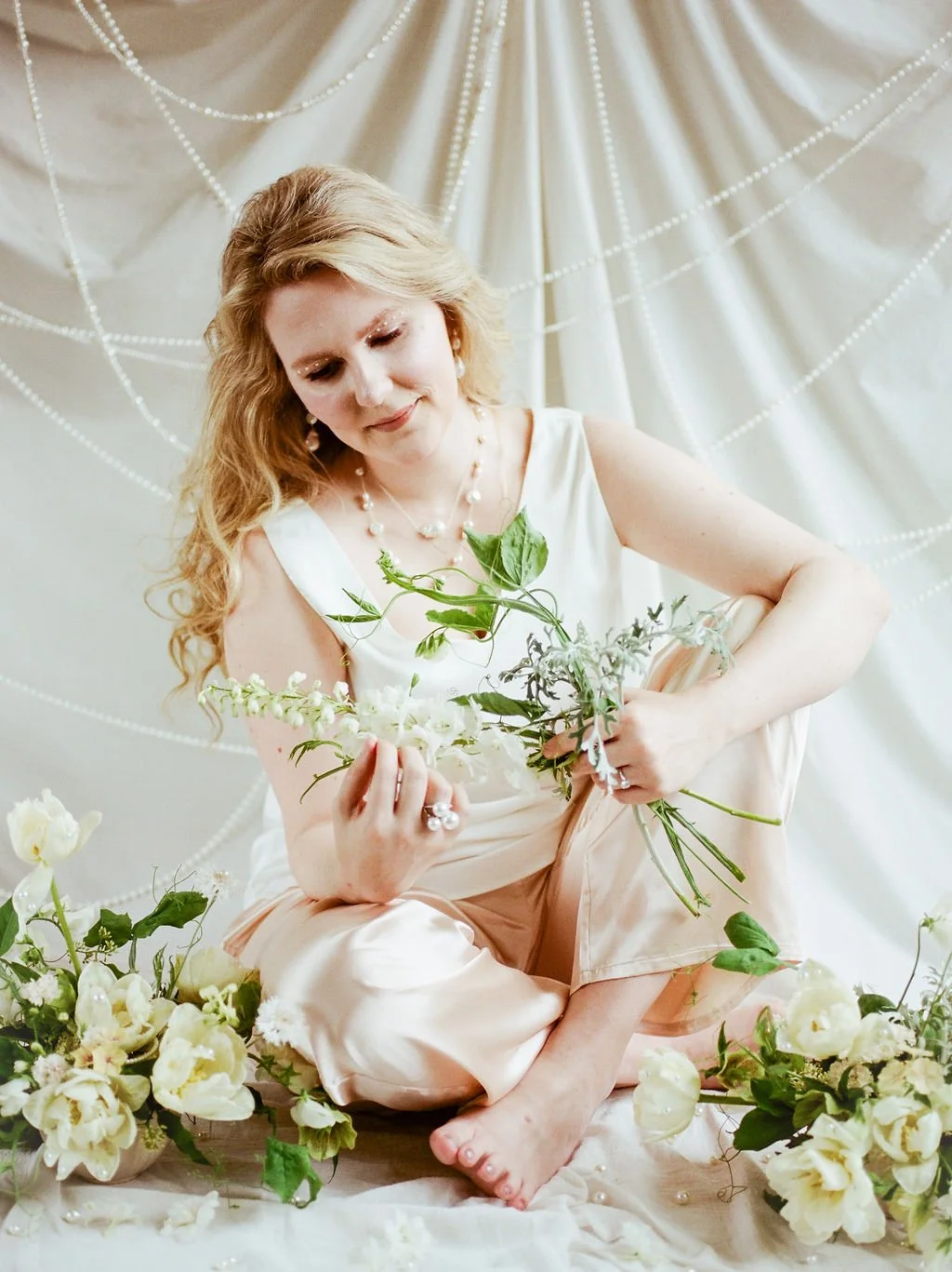 Hand-beaded pearl strands, handcrafted baroque pearl jewelry, and delicate, airy flowers set against a beautifully draped fabric backdrop—every detail of this editorial shoot was simply breathtaking. Petals and Pearls speaks to the beauty of simplicity, offering an inviting and authentic glimpse into a peaceful moment, perfect for those seeking elegance and calm in life’s quietest spaces.